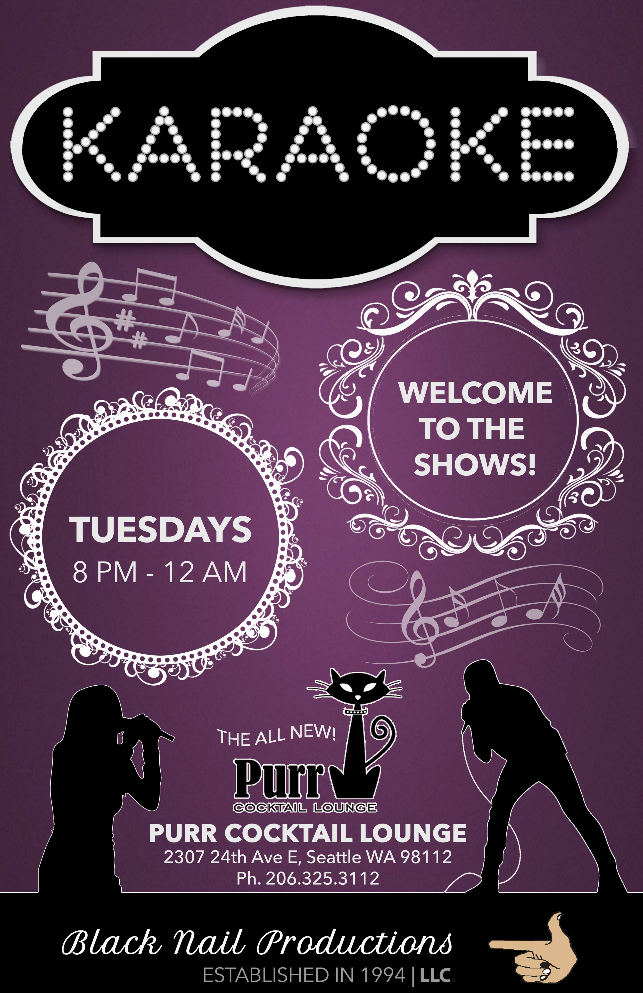 Black Nail Productions presents Karaoke at Purr Cocktail Lounge in Seattle on Tuesdays from 8 PM to 12 Midnight.