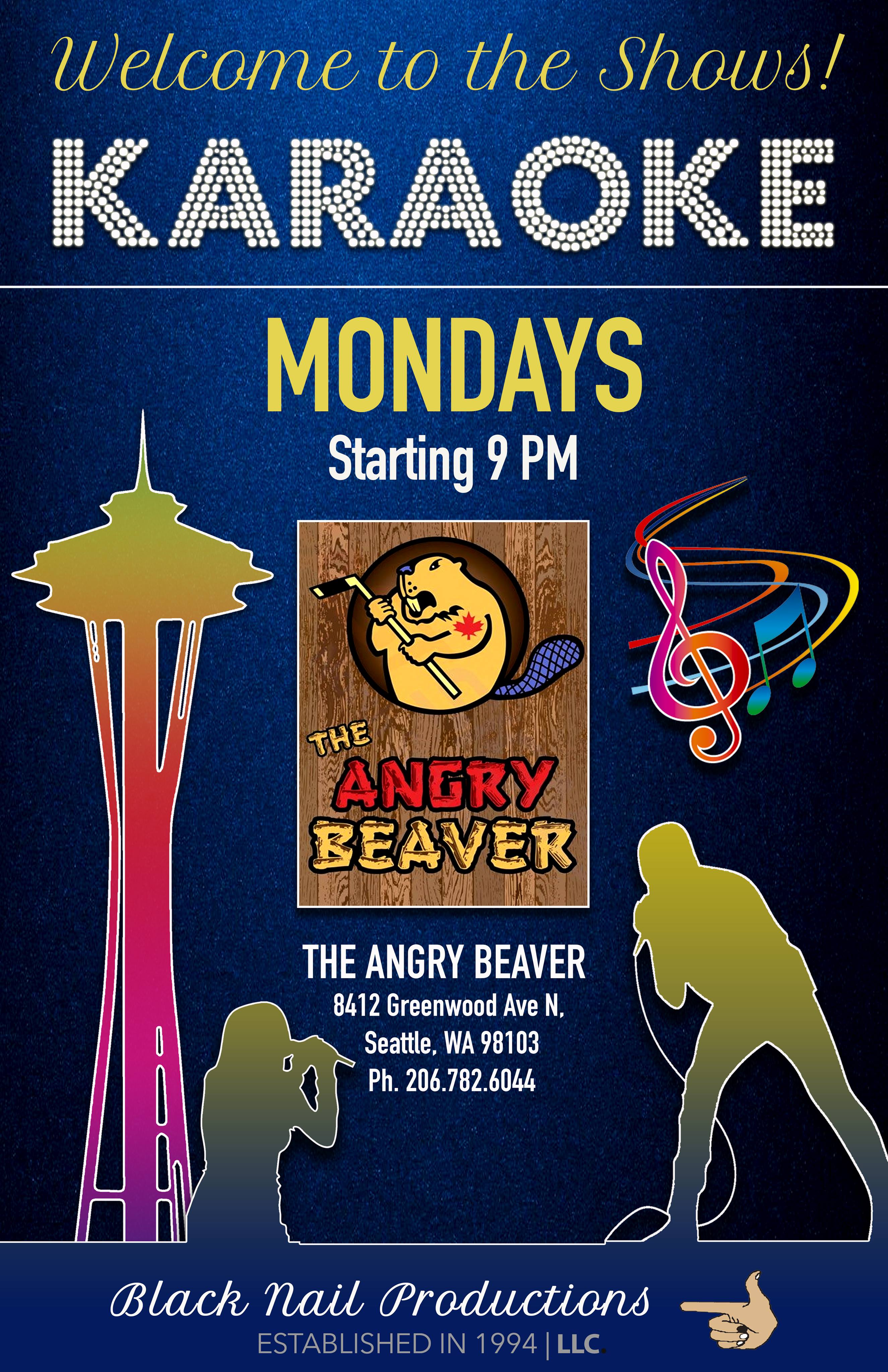 Black Nail Productions presents Karaoke at The Angry Beaver in Greenwood, Seattle, on Monday nights from 9 PM to 1 AM starting 10/22.